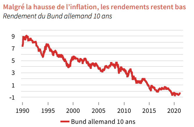 Ces derniers mois, les anticipations du marché en matière d’inflation ont été dopées par la hausse des prix des matières premières, la croissance de la masse monétaire, les mesures d’aide fiscale et l’espoir d’une reprise économique imminente. Cette situation a exercé des pressions à la baisse sur les obligations. De fait, les investisseurs réclament une meilleure protection contre l’inflation, faisant ainsi grimper les rendements (les rendements évoluent en sens inverse des prix des obligations).